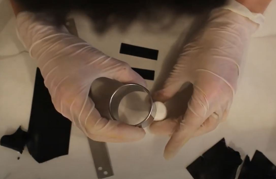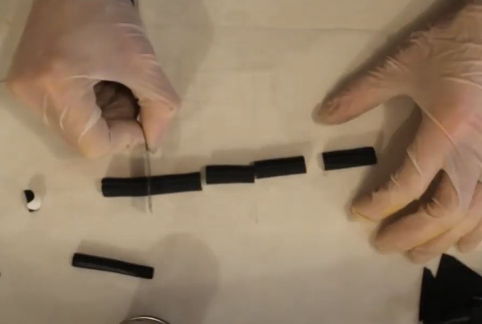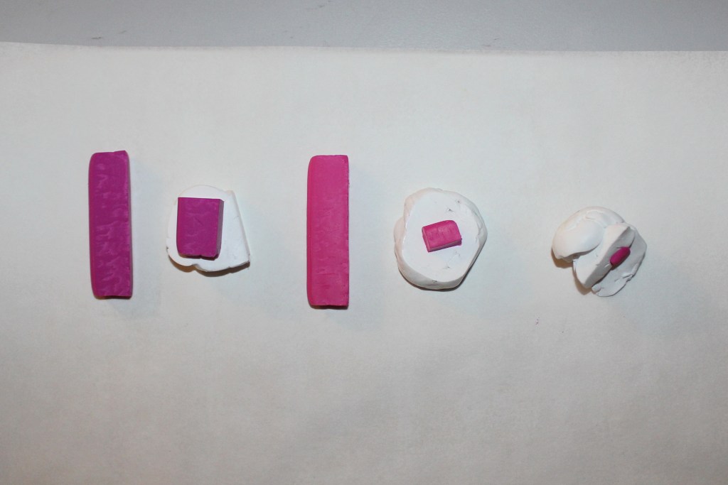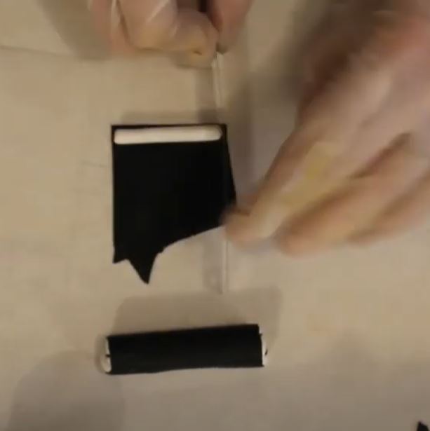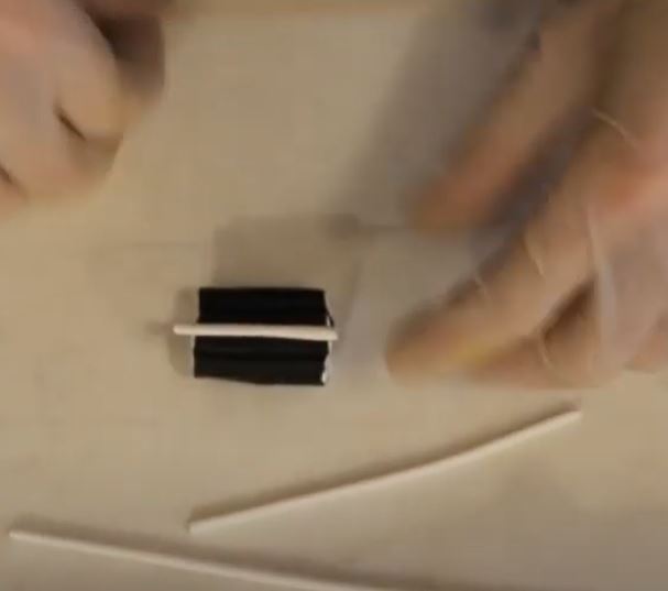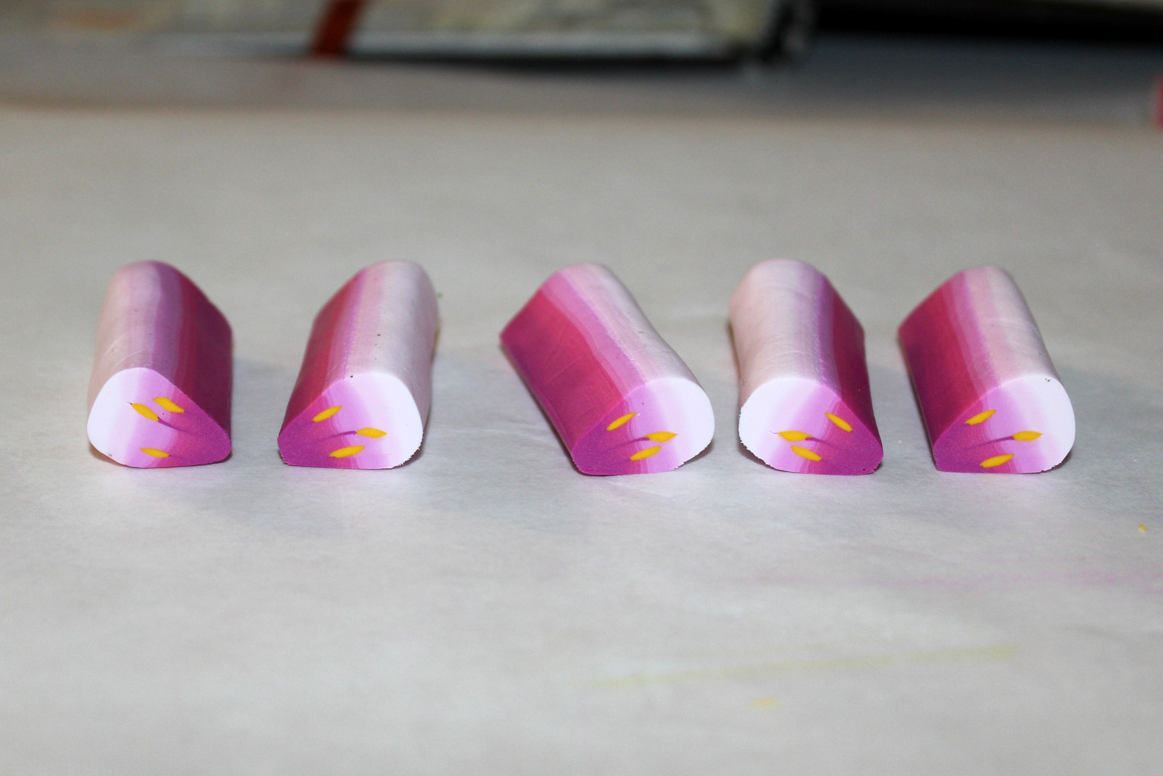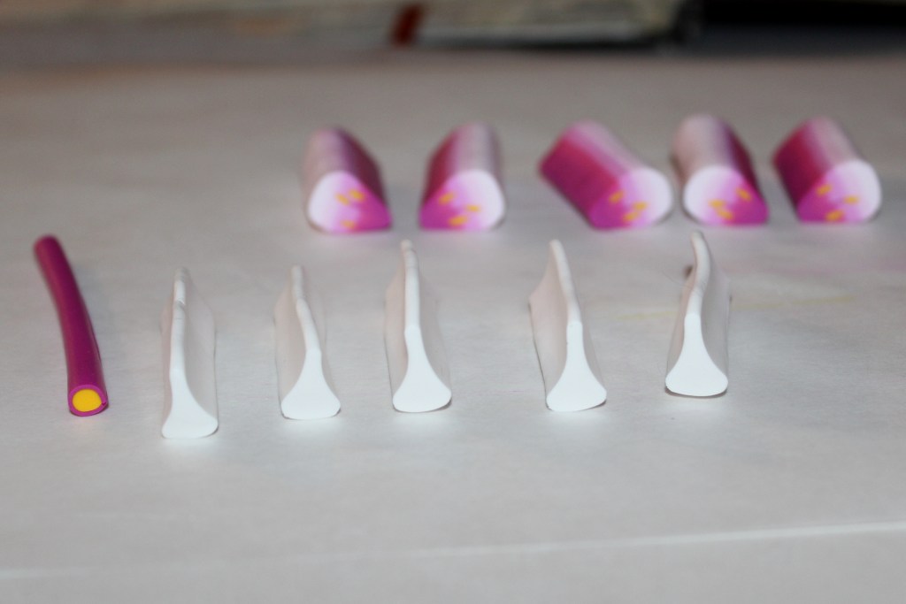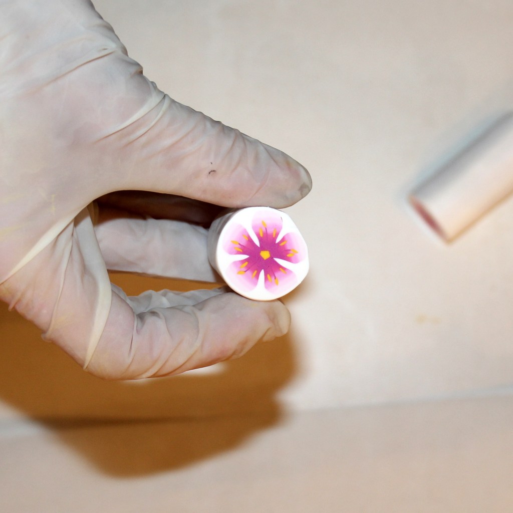 Il nous manque encore deux éléments pour assembler notre cane « fleur ». Tout d’abord, un cœur de fleur qui sera constitué des chutes de pistils et enfin la pâte qui va venir s’intercaler entre les pétales. Préparez un prisme uni et coupez-le en autant de morceaux que de pétales (donc 5, ici). Afin de faciliter le montage de la cane, prenez chaque tronçon du prisme et pincez-le légèrement dans la machine à pâte au cran large :