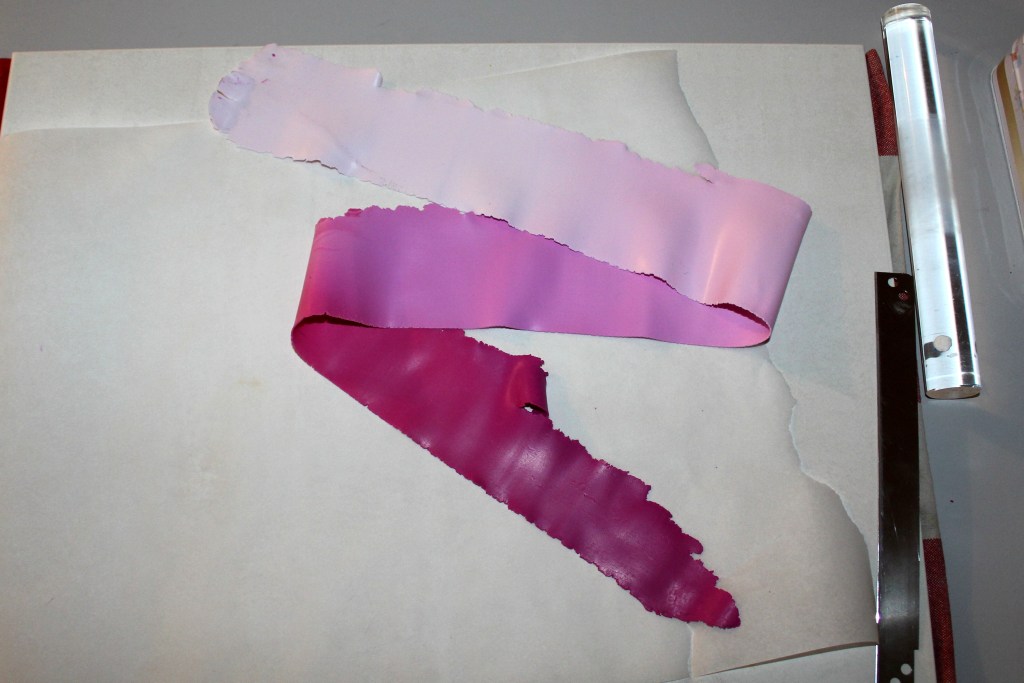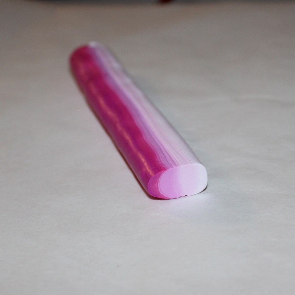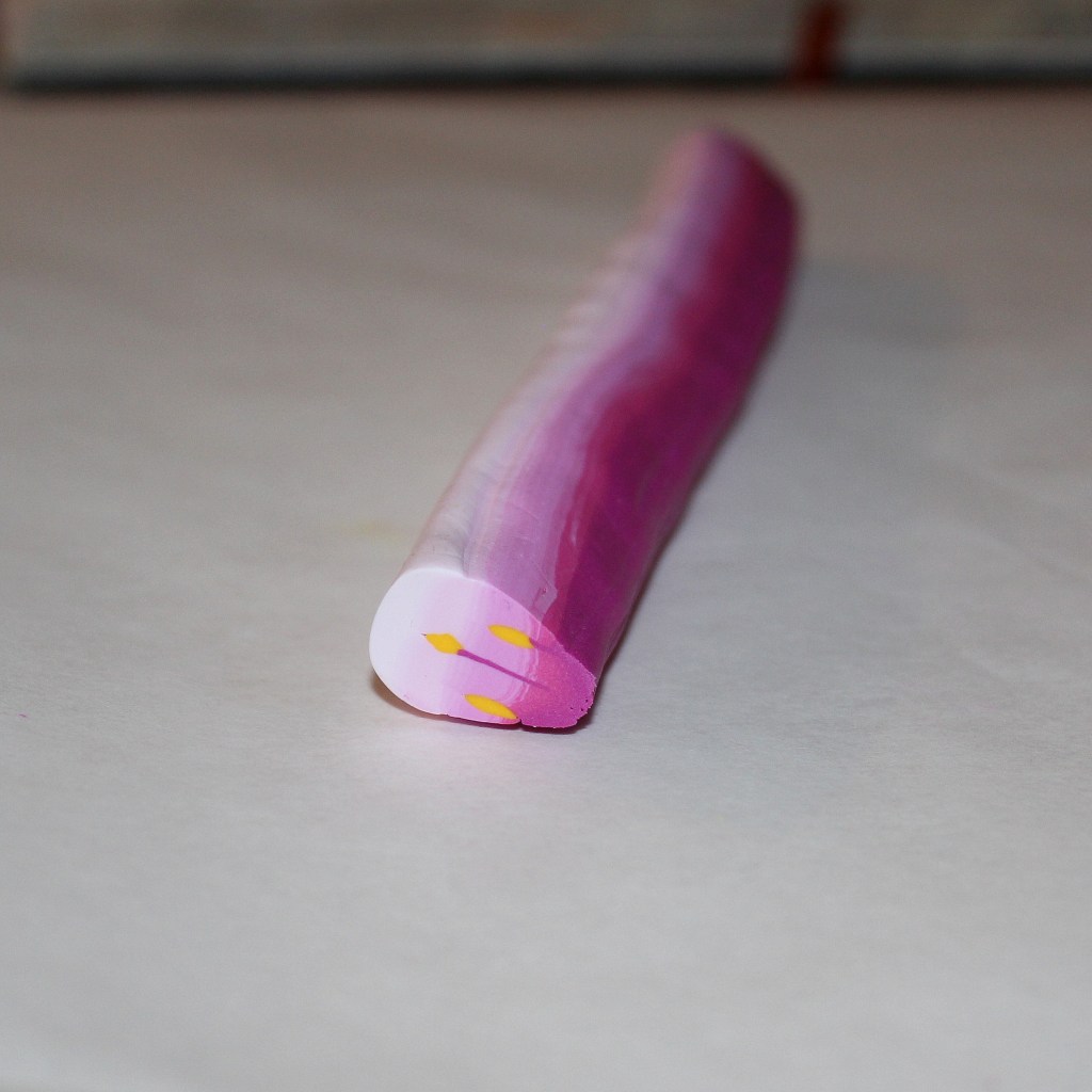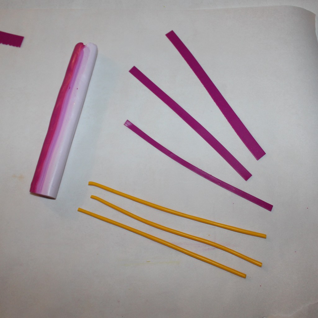 L’opération va consister à fendre la cane dégradée sur tout sa longueur mais pas sur toute son épaisseur à l’aide d’une lame rigide. insérer un premier boudin jaune puis une bande fushia et refermer sans insister sur la pâte.