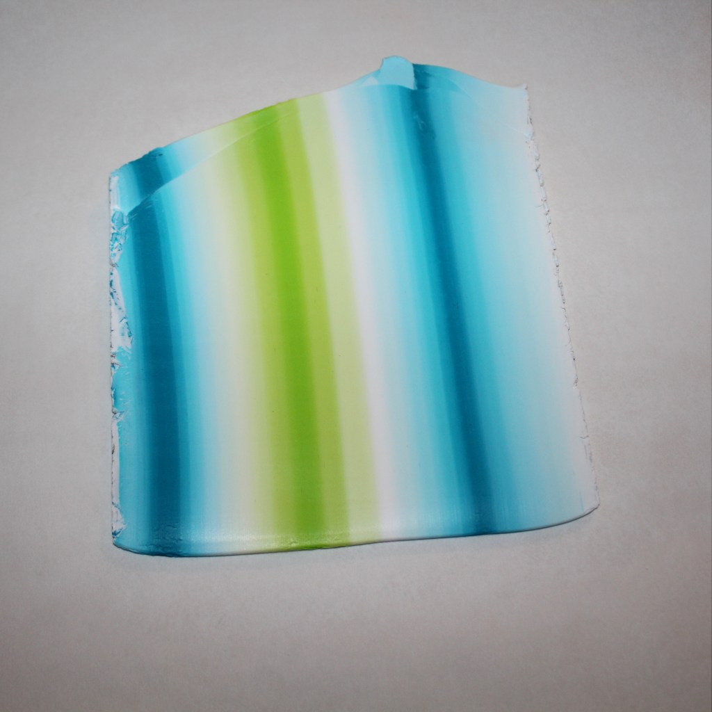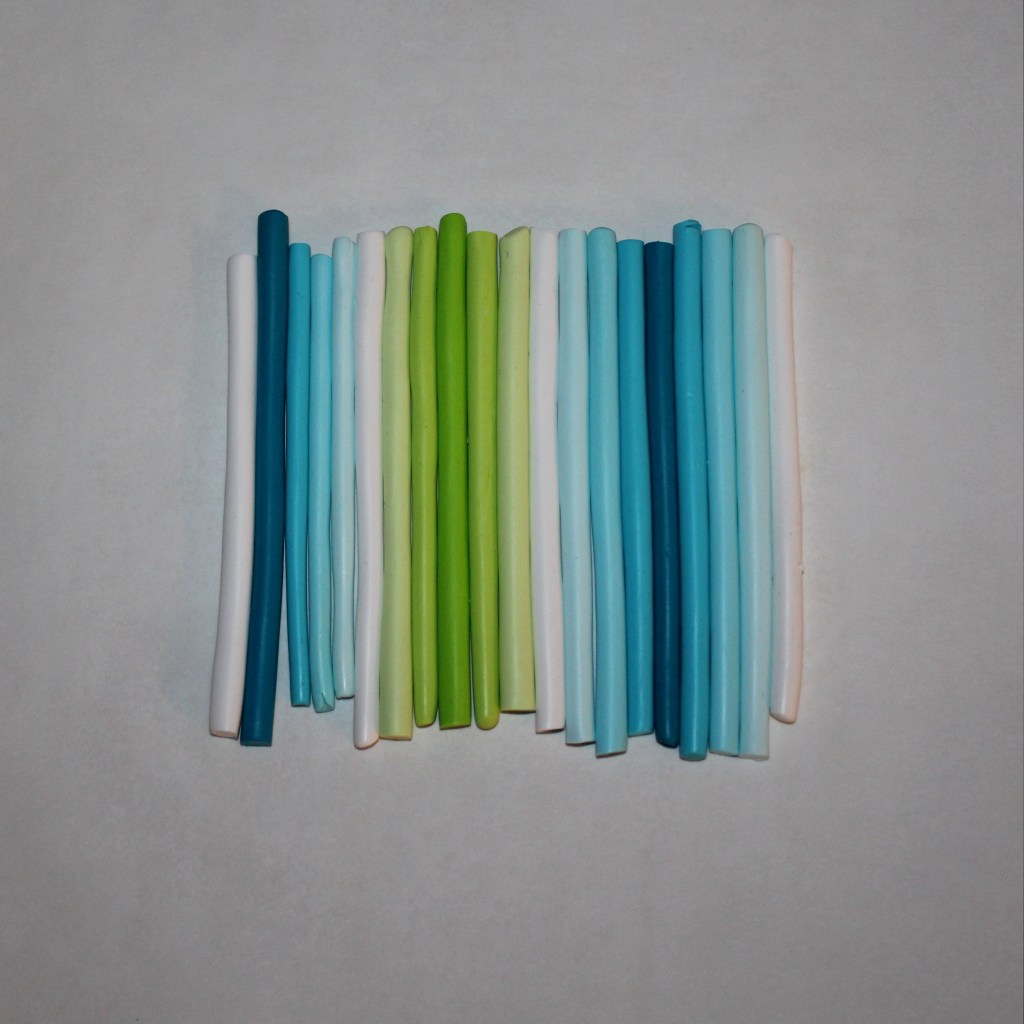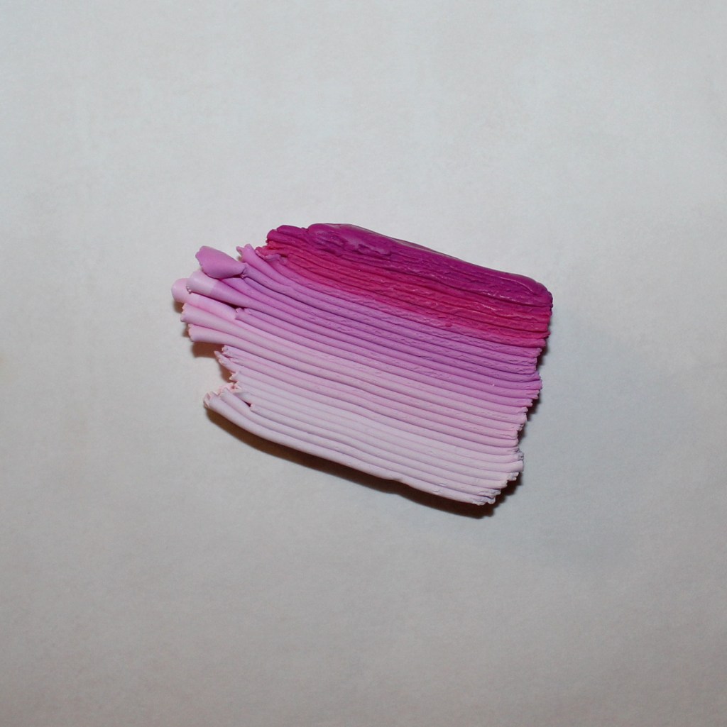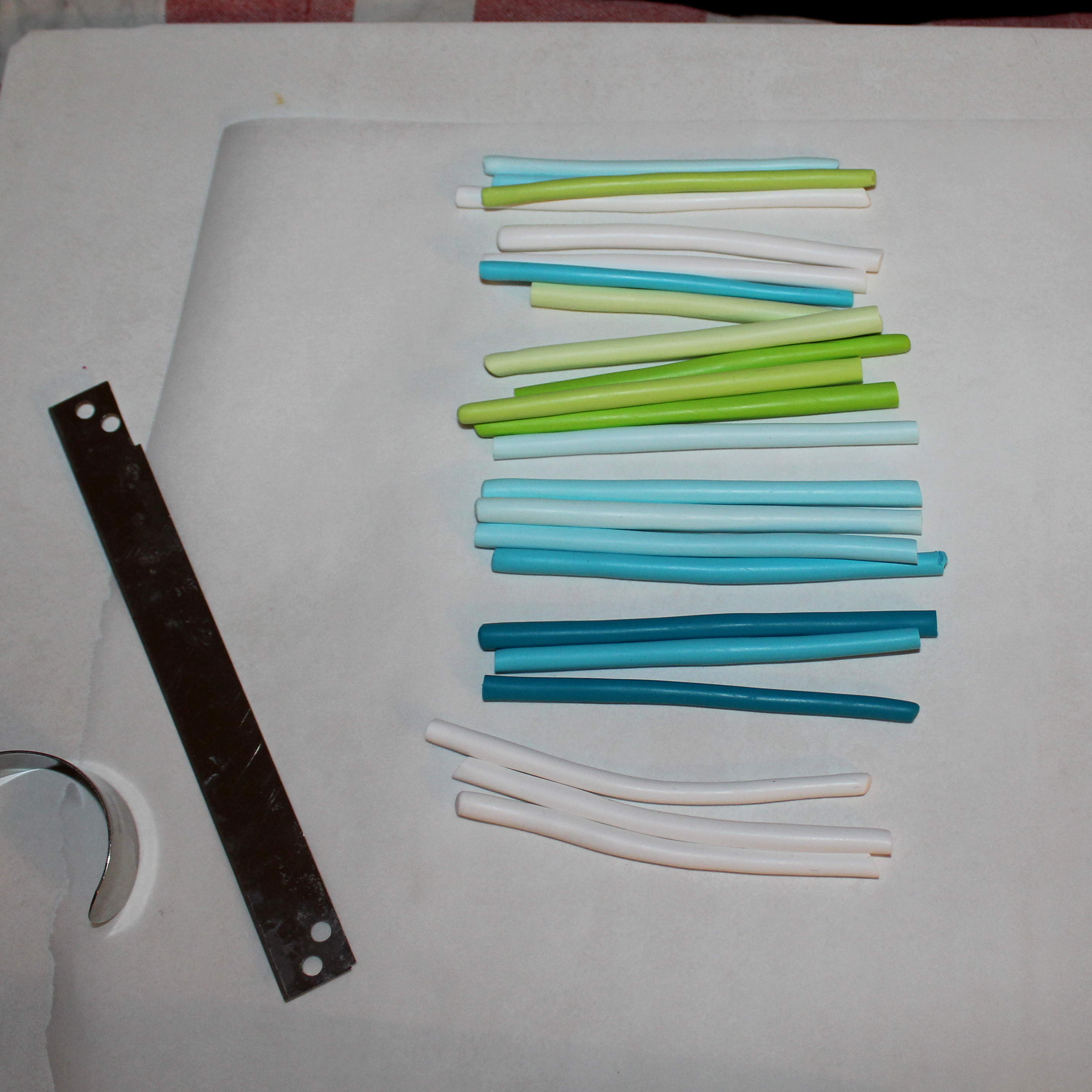 Comme très souvent (tout le temps, en fait, presque, Marie), commencez par réaliser un dégradé à l’aide de la machine à pâte au cran large. (rappel : après avoir modelé les couleurs en triangles, passez l’ensemble dans la map au cran large, pliez la plaque en deux de bas en haut et repassez dans la map. Répétez l’opération une quinzaine de fois jusqu’à l’obtention d’un fondu des couleurs. Une fois la plaque dégradée satisfaisante, coupez-la en deux et doublez l’épaisseur puis passez-la de nouveau dans la map dans l’autre sens, cette fois, pour éloigner les couleurs les unes des autres. Faites ceci jusqu’au cran le plus fin possible afin d’obtenir un long ruban dégradé).