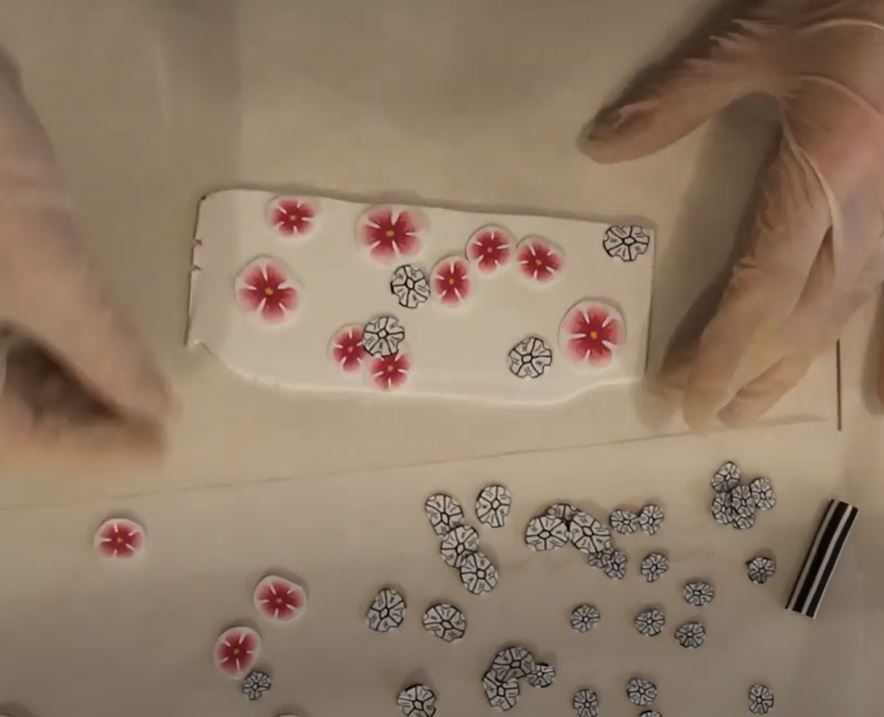 Il est à présent temps de monter votre cane fleur en alternant un tronçon « pétale » et un tronçons prisme blanc autour de la mini cane cible centrale :