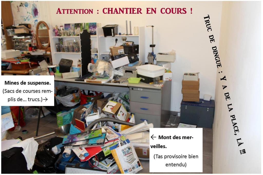 Le moins que je puisse dire est que ce ne fut pas chose aisée. Chaque phase de rangement connaît son épisode de « chantier » durant lequel il semble que le bazar est ENCORE plus important qu’au départ, (et oui, c’est toujours possible…) vous savez, cette phase de CHAOS indescriptible qui met nos nerfs en tensions et qui teste véritablement notre aptitude à mener ce projet à terme ou bien qui révèle au contraire notre abattement le plus profond et le fait qu’on avait placé la barre trop haut.
