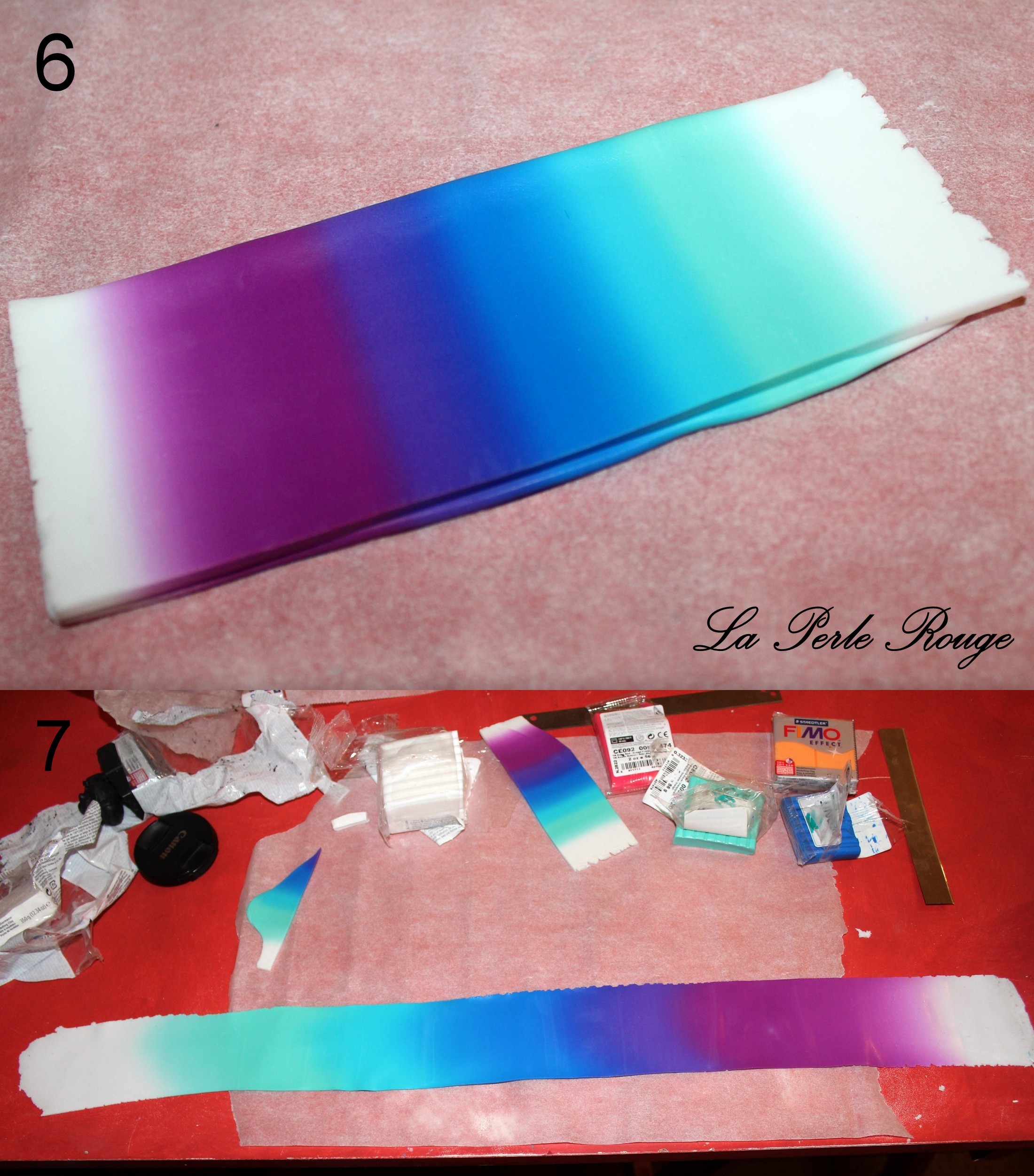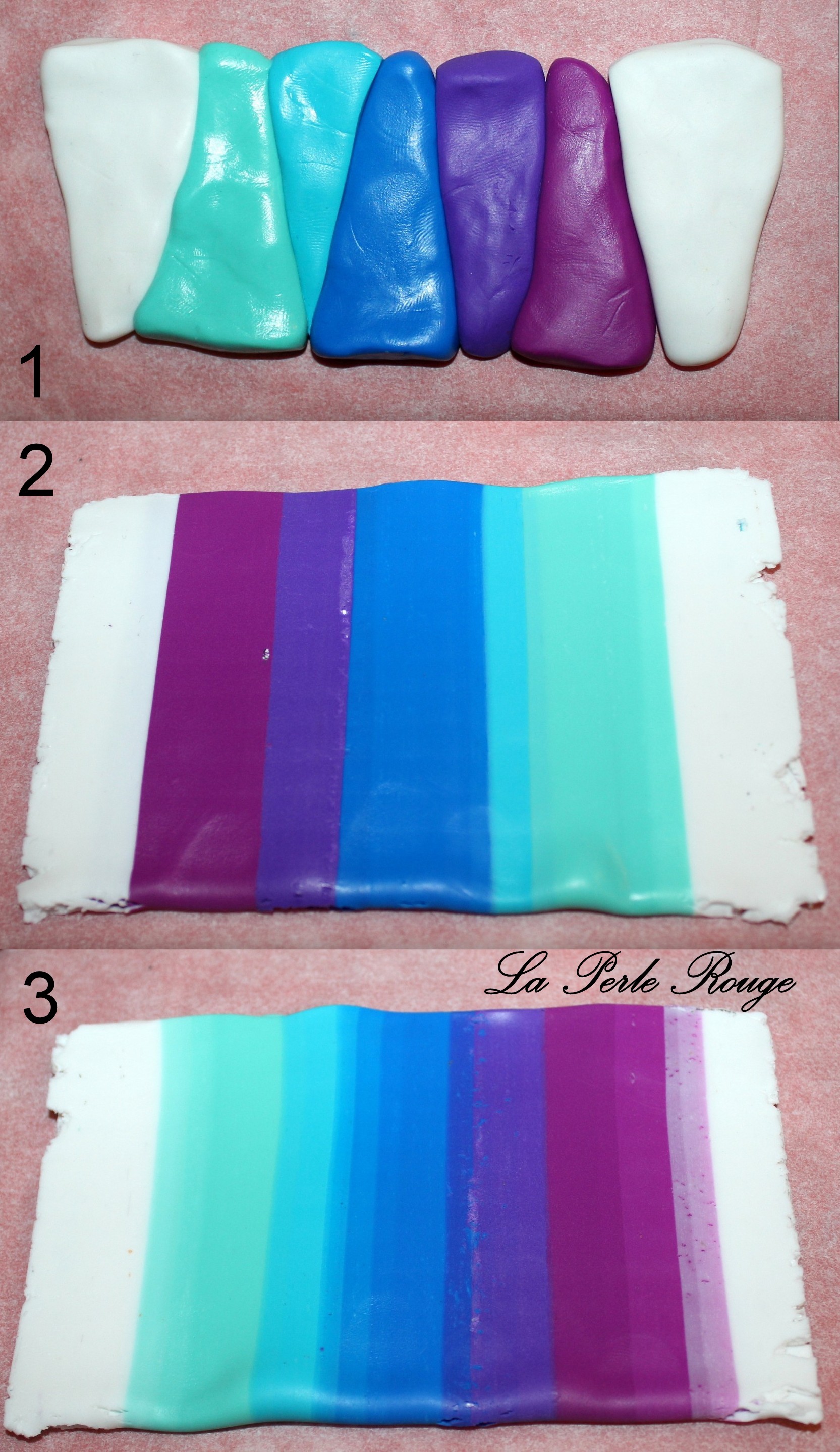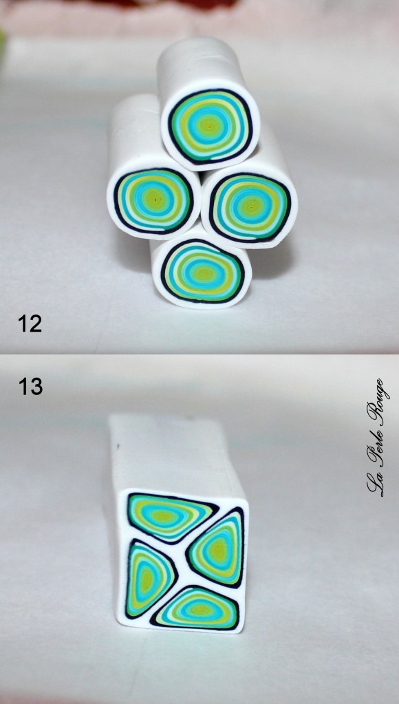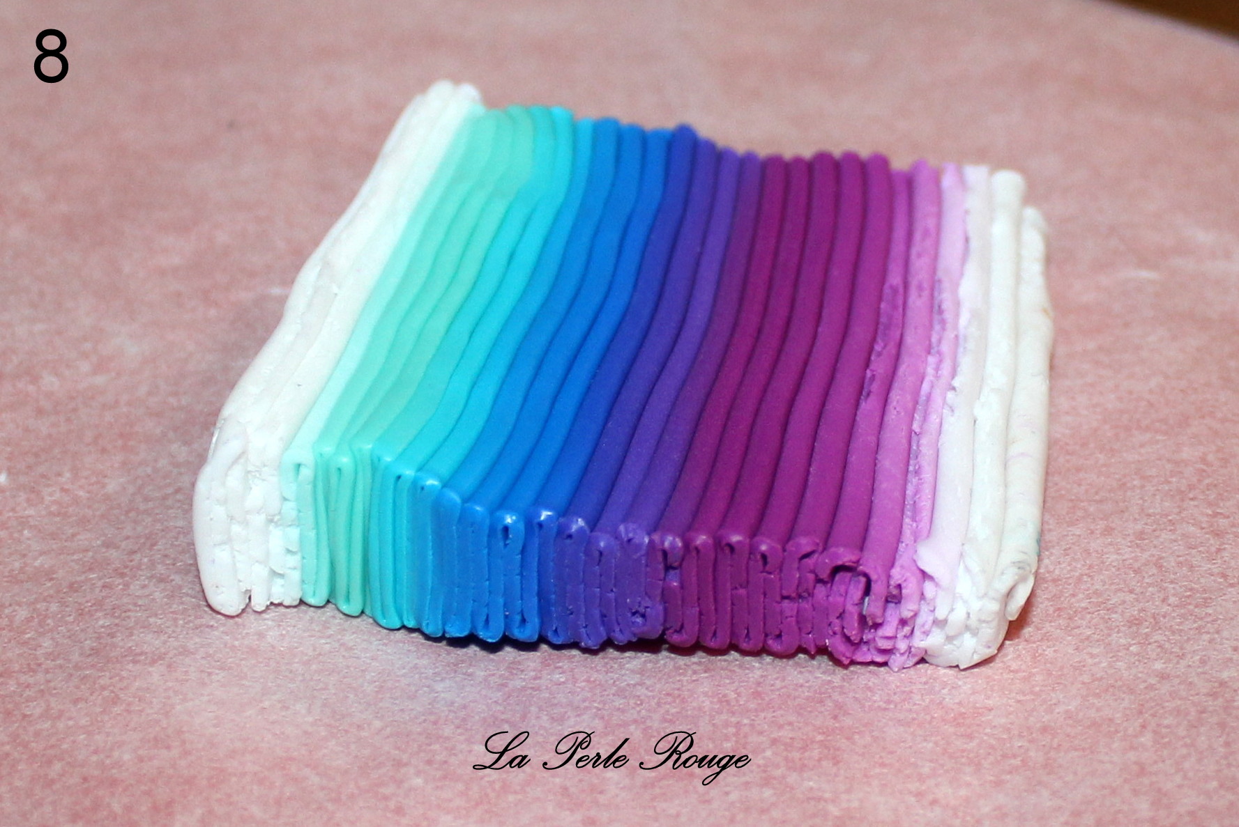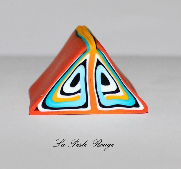 Comme très souvent (tout le temps, en fait, presque, Marie), commencez par réaliser un dégradé à l’aide de la machine à pâte au cran large. (rappel : après avoir modelé les couleurs en triangles, passez l’ensemble dans la map au cran large, pliez la plaque en deux de bas en haut et repassez dans la map. Répétez l’opération une quinzaine de fois jusqu’à l’obtention d’un fondu des couleurs. Une fois la plaque dégradée satisfaisante, coupez-la en deux et doublez l’épaisseur puis passez-la de nouveau dans la map dans l’autre sens, cette fois, pour éloigner les couleurs les unes des autres. Faites ceci jusqu’au cran le plus fin possible afin d’obtenir un long ruban dégradé).