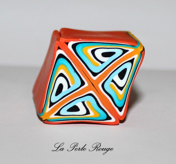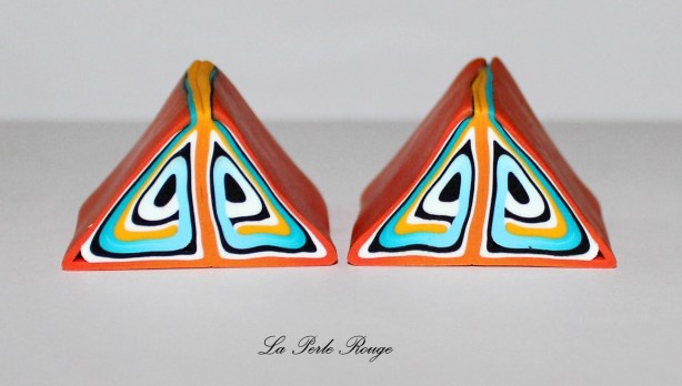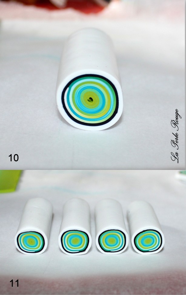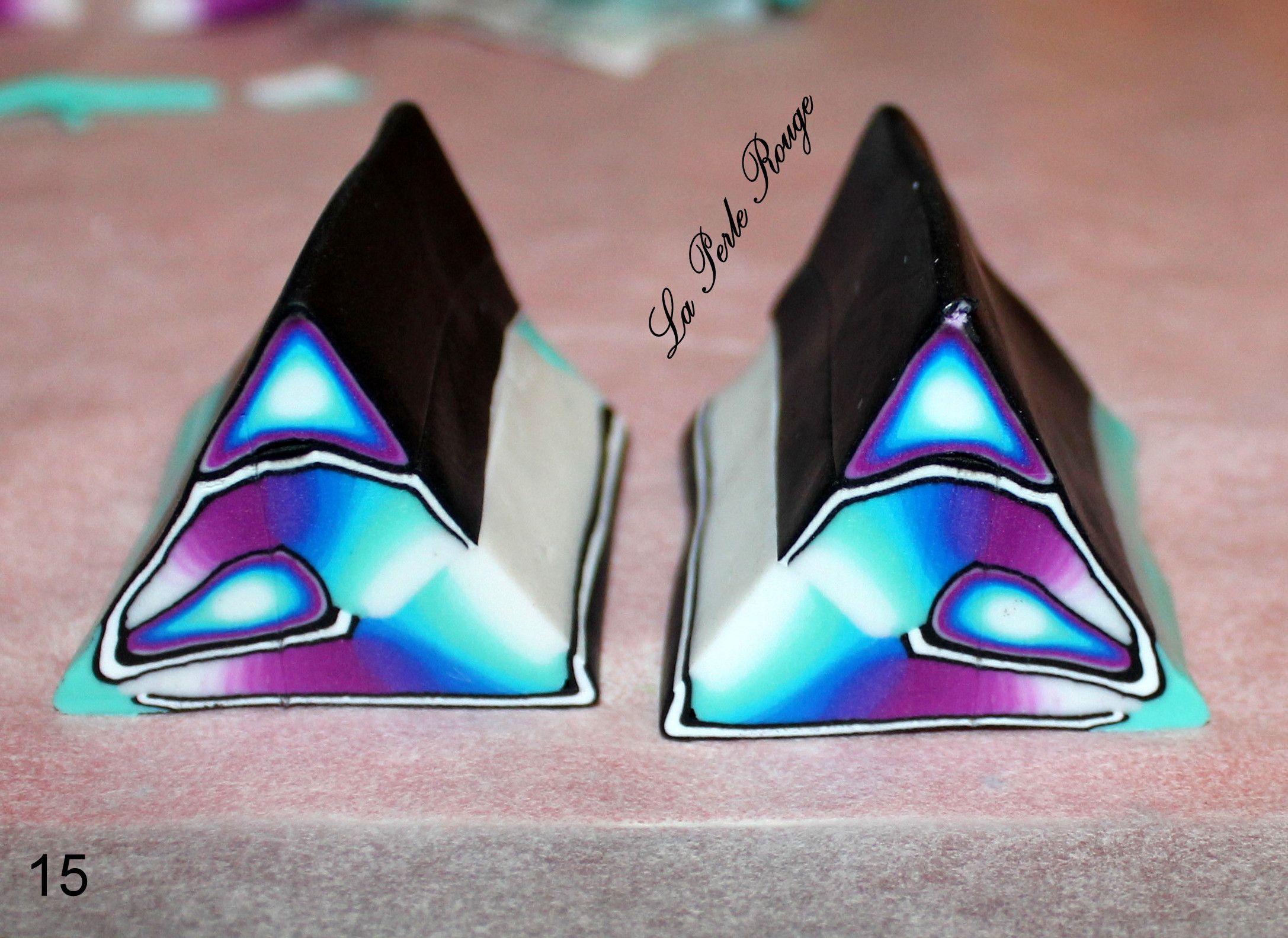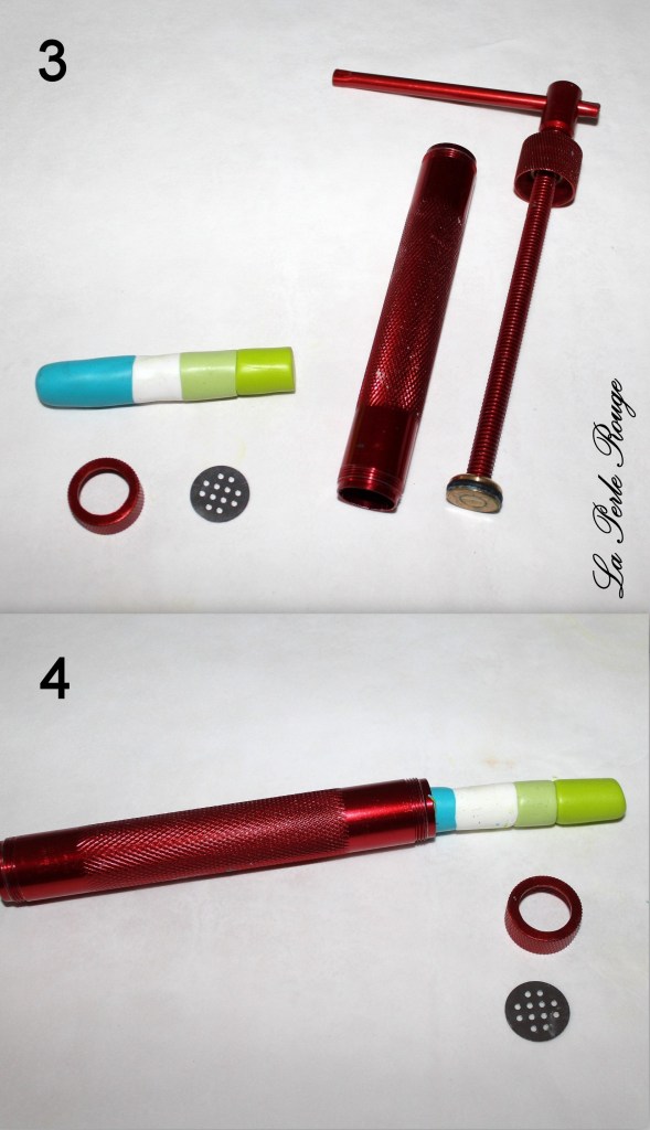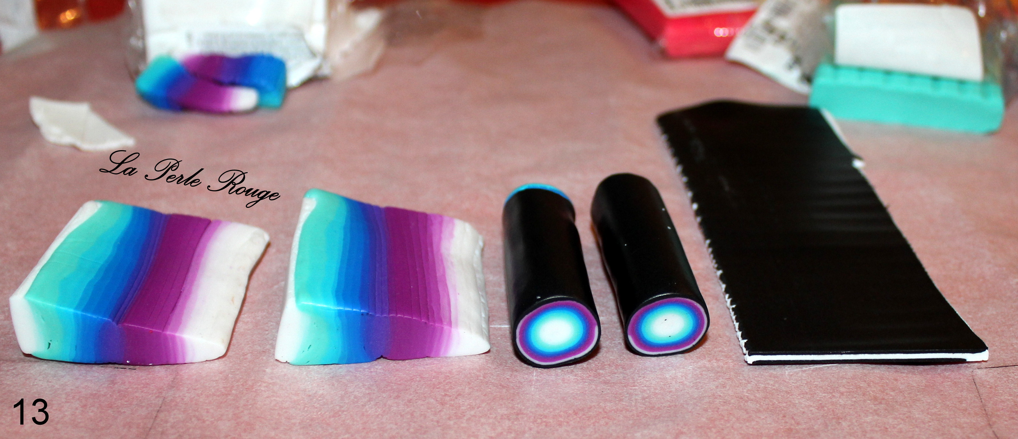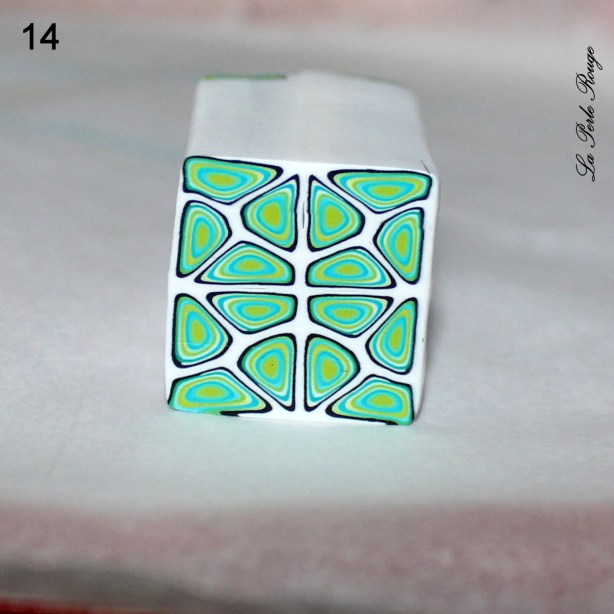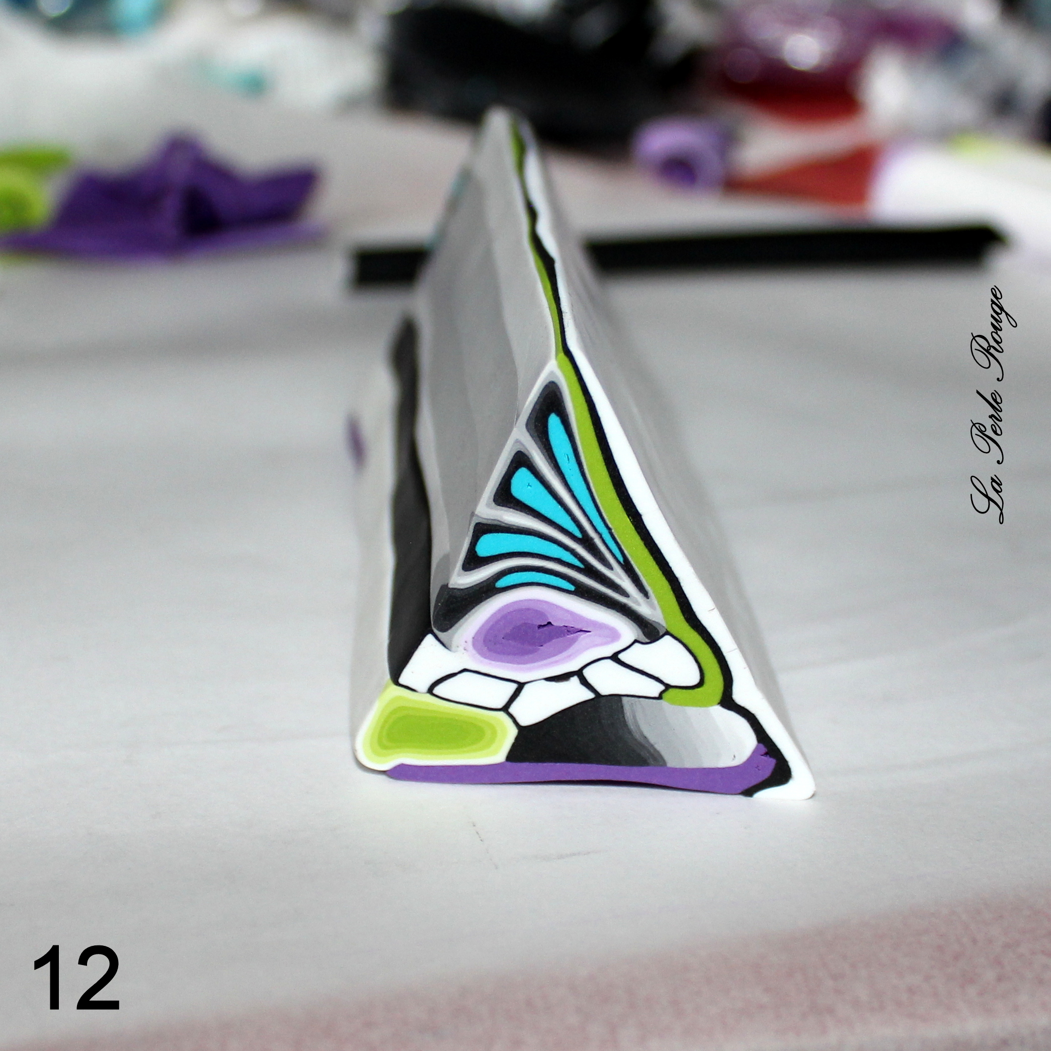 Comme très souvent (tout le temps, en fait, presque, Marie), commencez par réaliser un dégradé à l’aide de la machine à pâte au cran large. (rappel : après avoir modelé les couleurs en triangles, passez l’ensemble dans la map au cran large, pliez la plaque en deux de bas en haut et repassez dans la map. Répétez l’opération une quinzaine de fois jusqu’à l’obtention d’un fondu des couleurs. Une fois la plaque dégradée satisfaisante, coupez-la en deux et doublez l’épaisseur puis passez-la de nouveau dans la map dans l’autre sens, cette fois, pour éloigner les couleurs les unes des autres. Faites ceci jusqu’au cran le plus fin possible afin d’obtenir un long ruban dégradé).