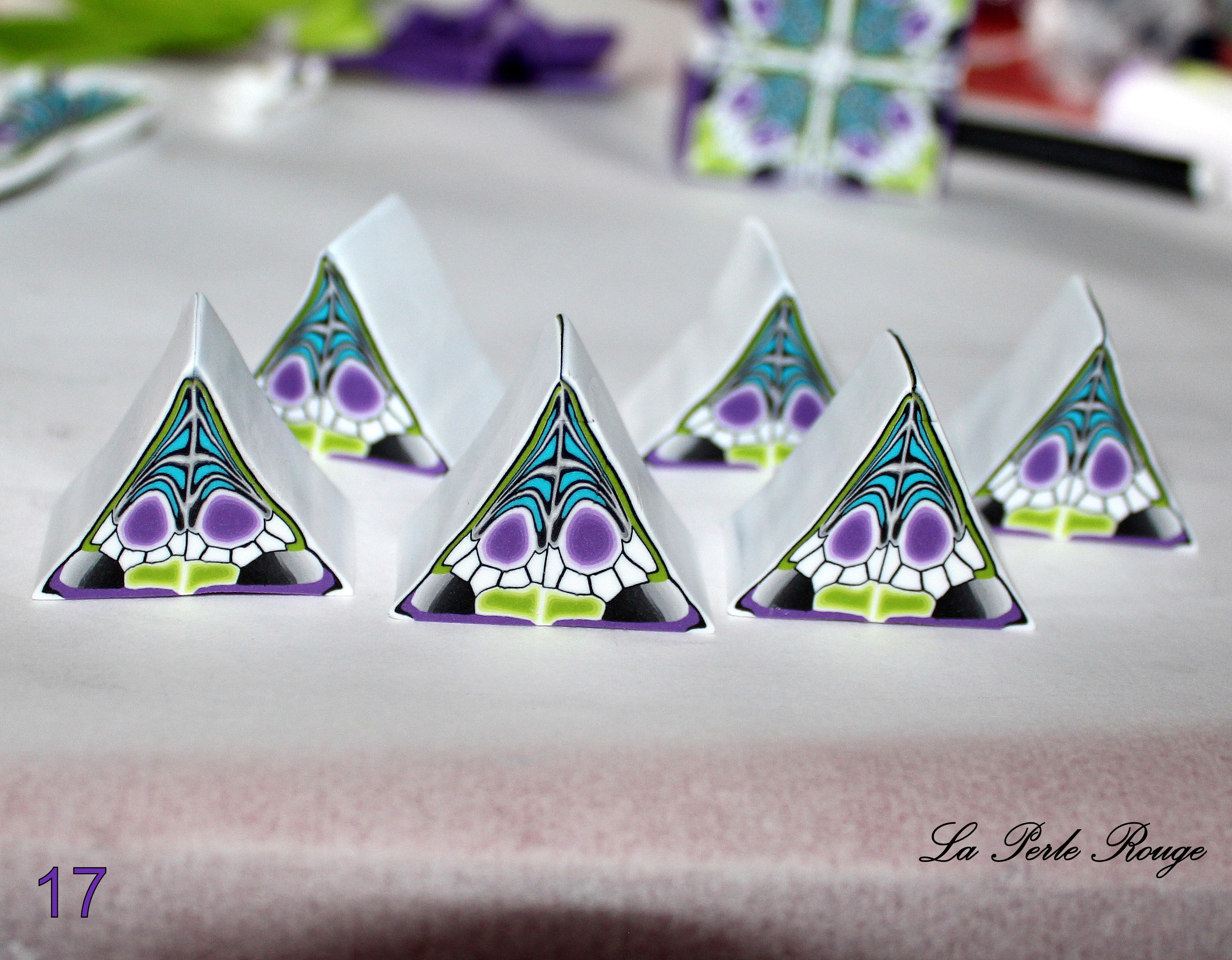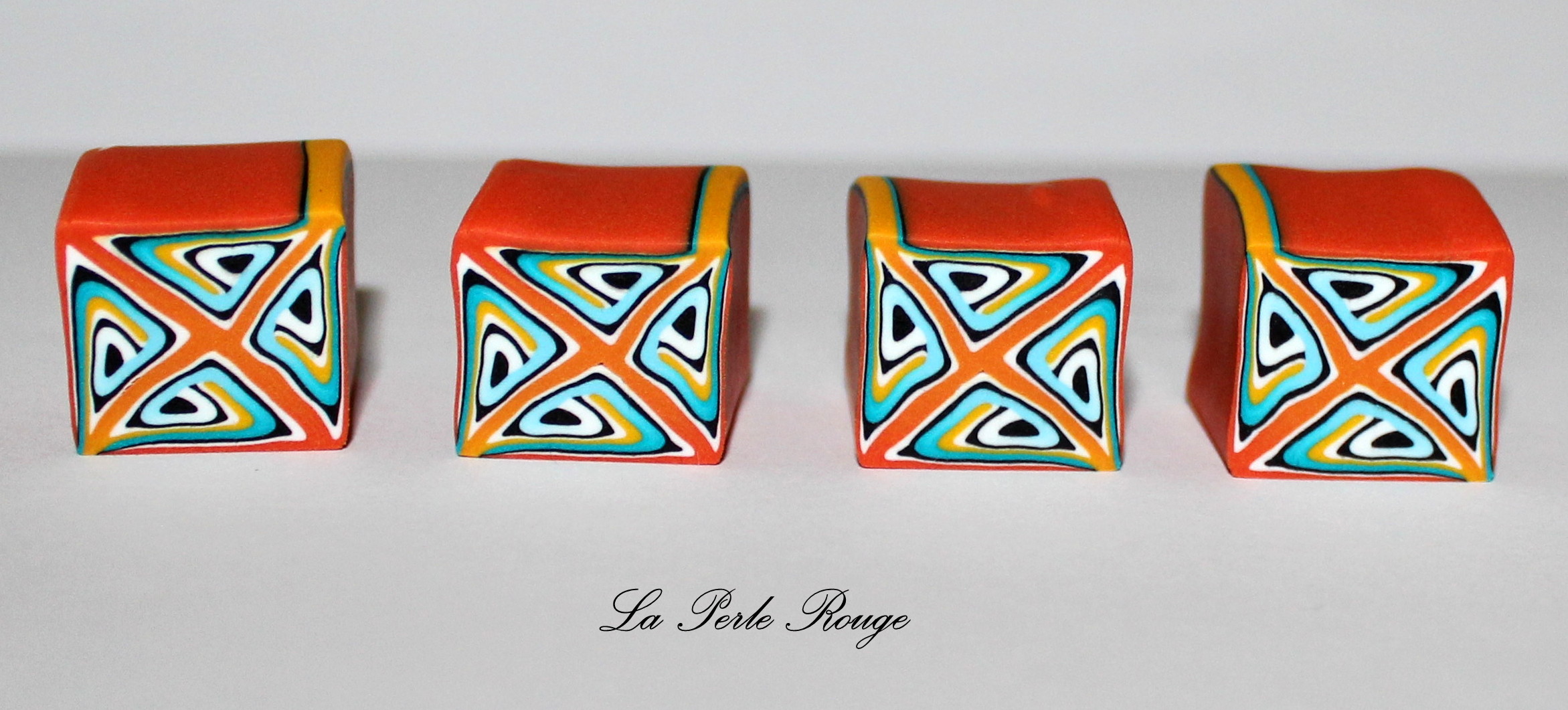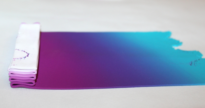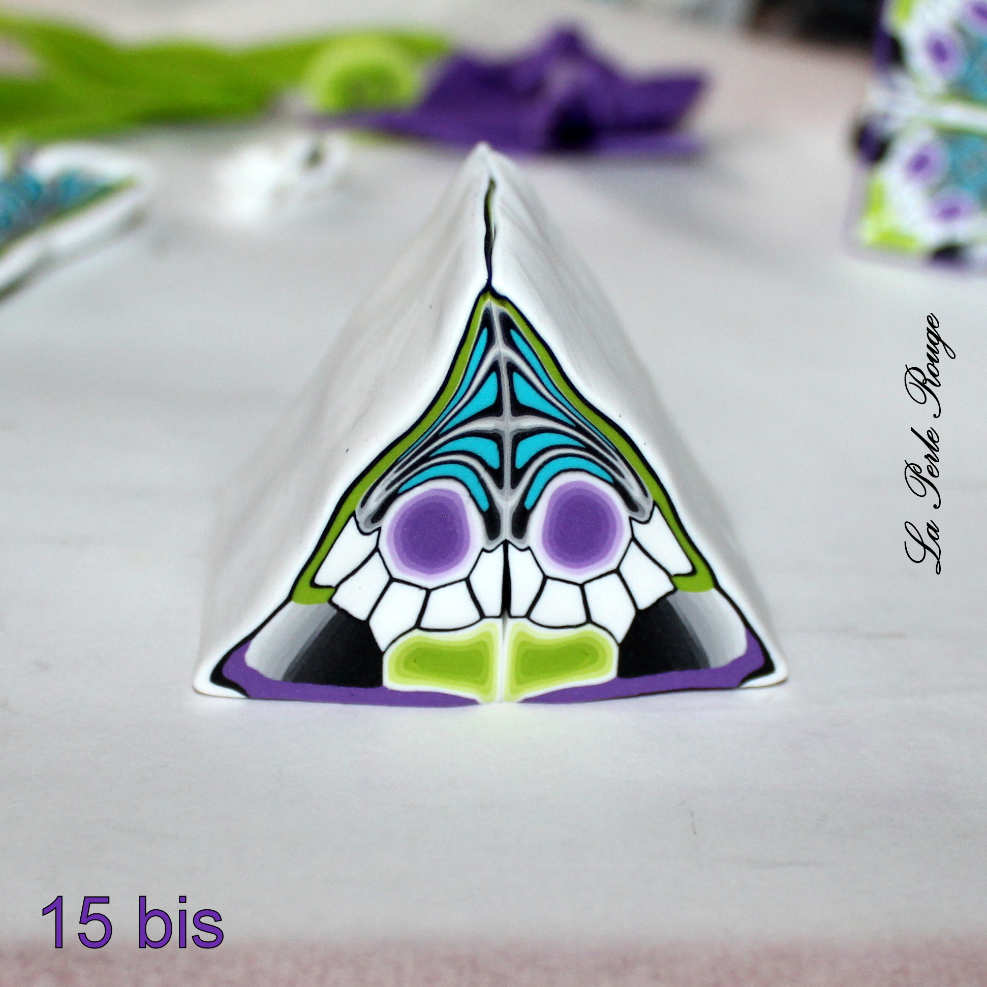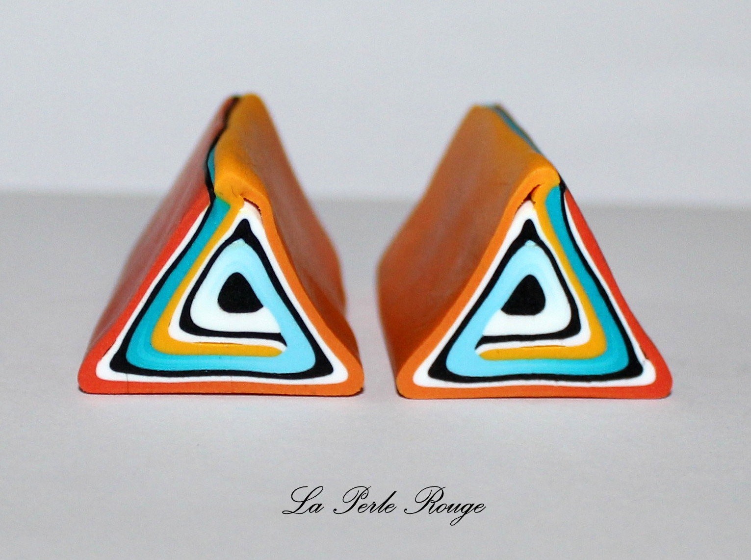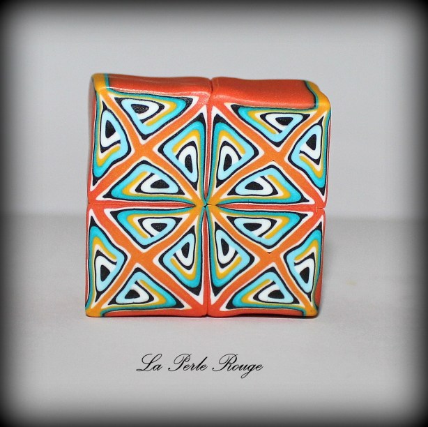 Comme très souvent (tout le temps, en fait, presque, Marie), commencez par réaliser un dégradé à l’aide de la machine à pâte au cran large. (rappel : après avoir modelé les couleurs en triangles, passez l’ensemble dans la map au cran large, pliez la plaque en deux de bas en haut et repassez dans la map. Répétez l’opération une quinzaine de fois jusqu’à l’obtention d’un fondu des couleurs. Une fois la plaque dégradée satisfaisante, coupez-la en deux et doublez l’épaisseur puis passez-la de nouveau dans la map dans l’autre sens, cette fois, pour éloigner les couleurs les unes des autres. Faites ceci jusqu’au cran le plus fin possible afin d’obtenir un long ruban dégradé).