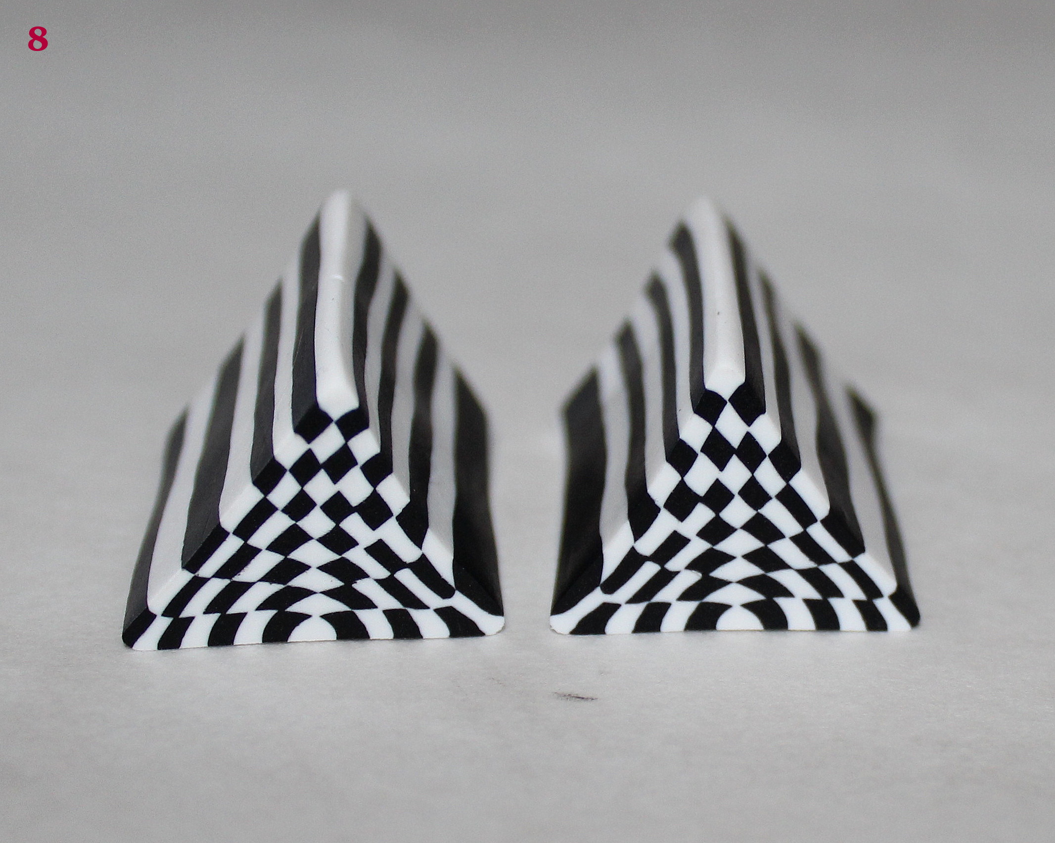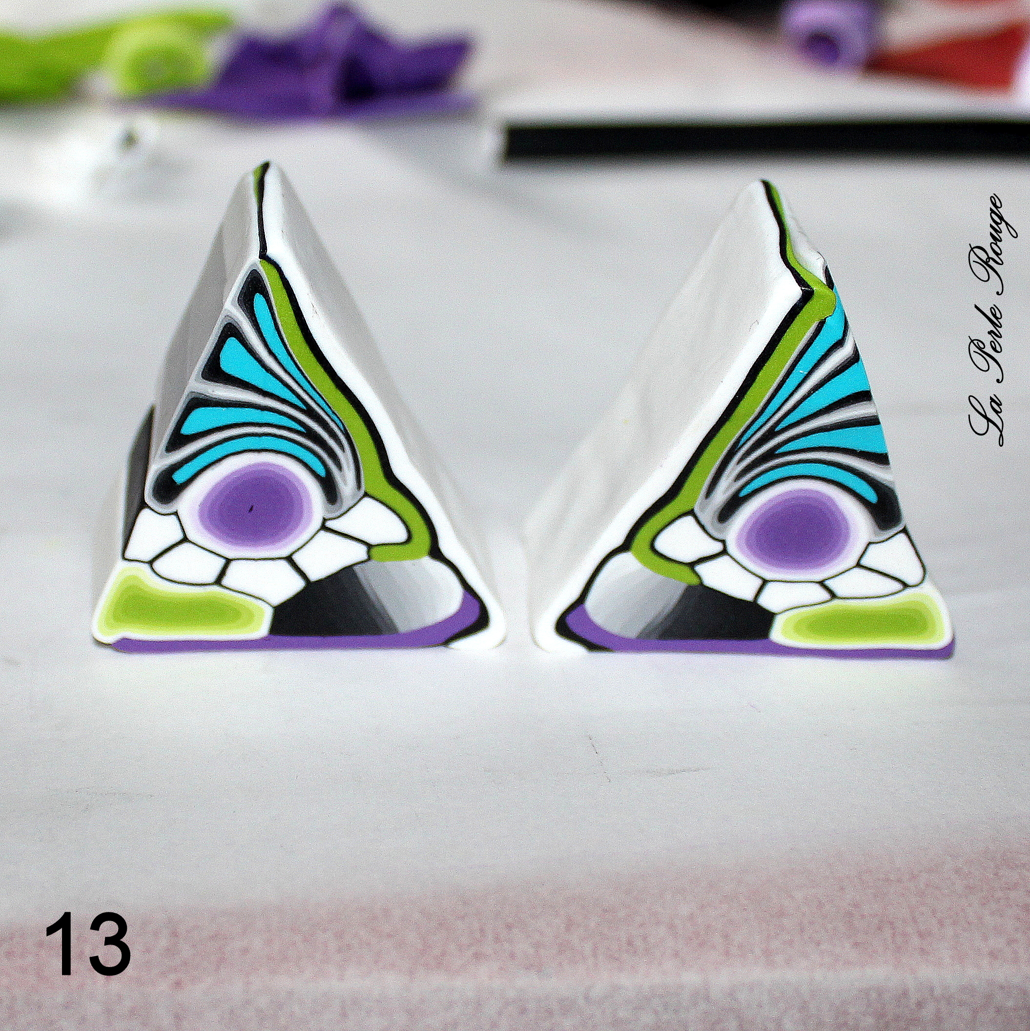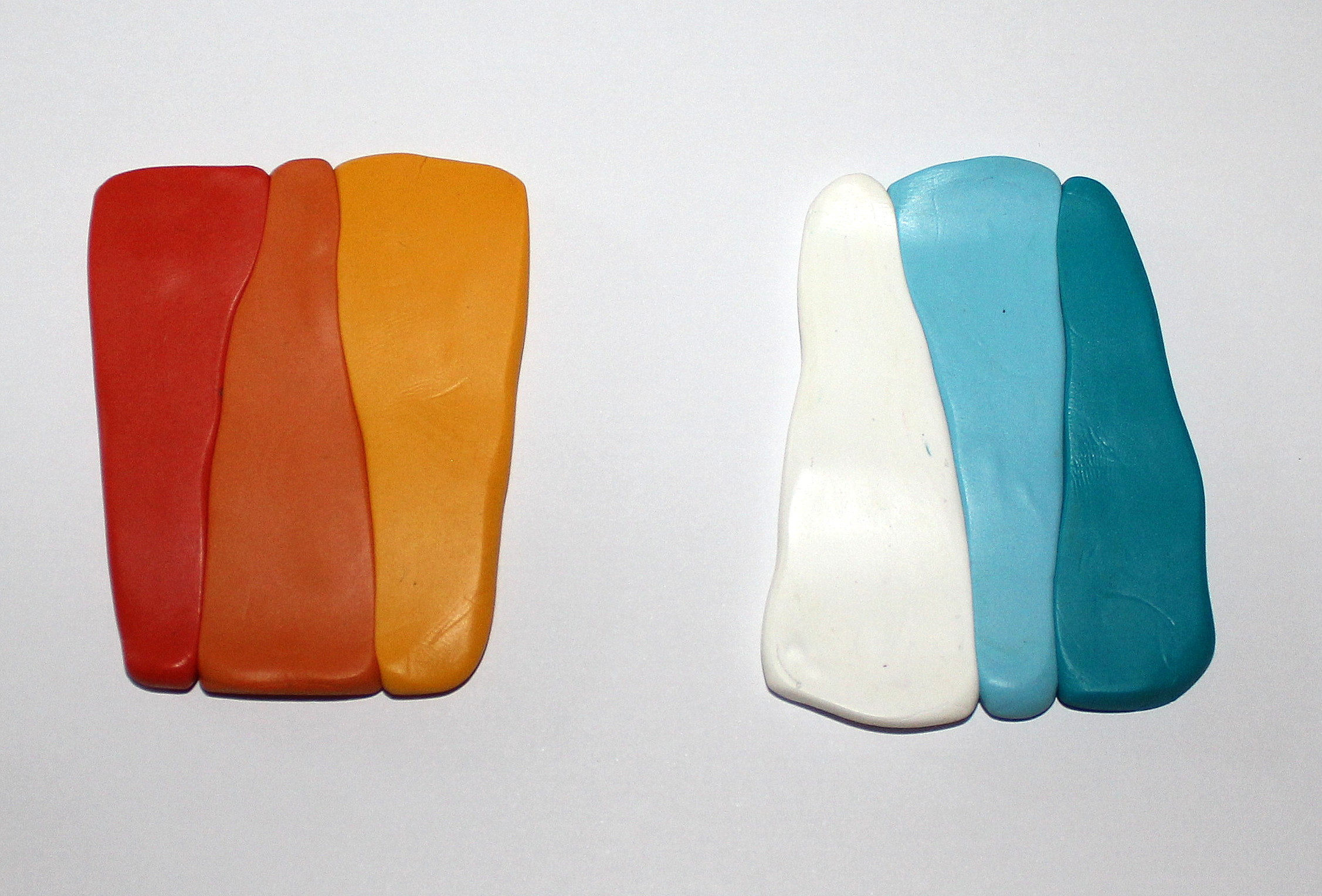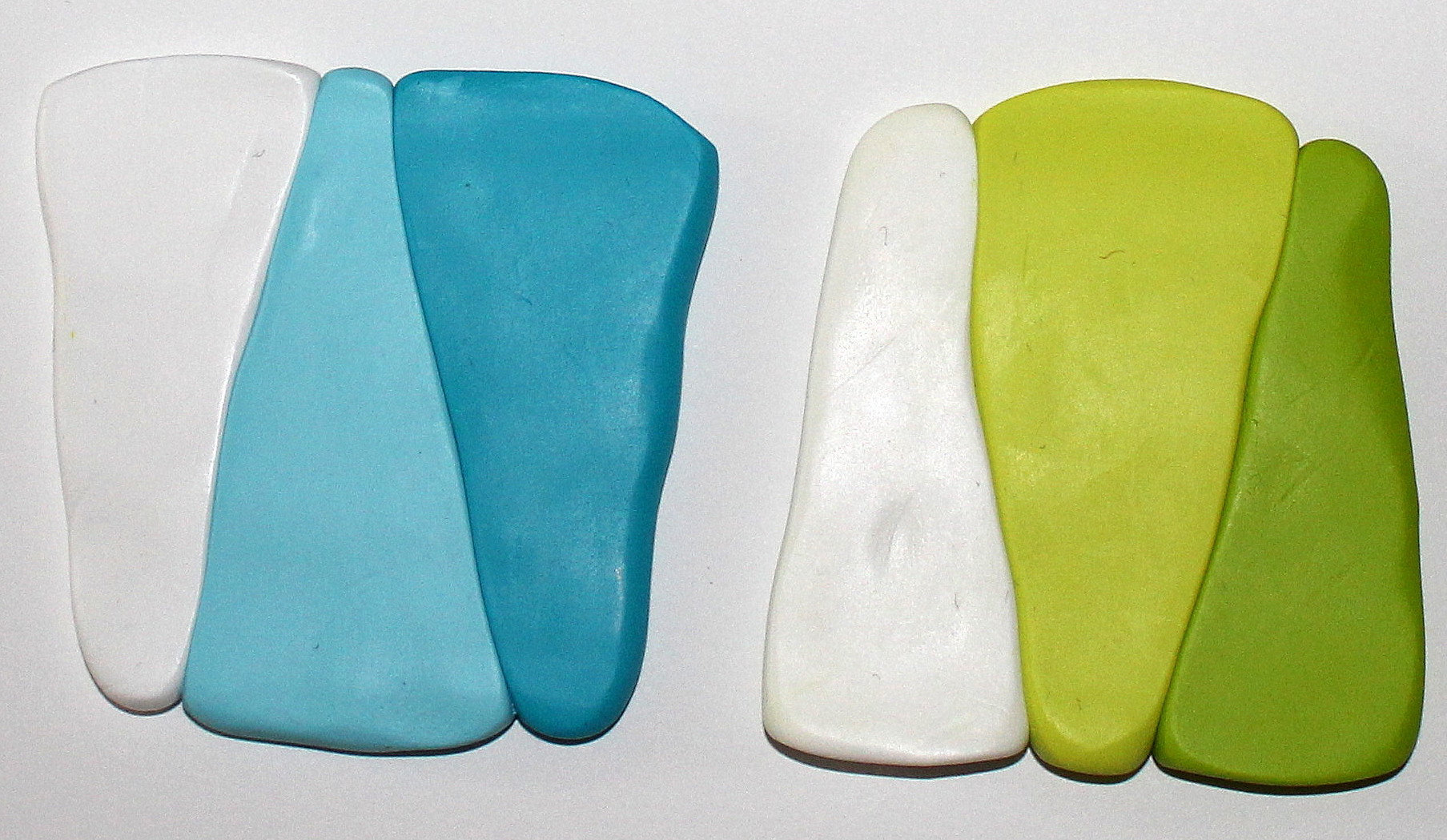 Comme très souvent (tout le temps, en fait, presque, Marie), commencez par réaliser un dégradé à l’aide de la machine à pâte au cran large. (rappel : après avoir modelé les couleurs en triangles, passez l’ensemble dans la map au cran large, pliez la plaque en deux de bas en haut et repassez dans la map. Répétez l’opération une quinzaine de fois jusqu’à l’obtention d’un fondu des couleurs. Une fois la plaque dégradée satisfaisante, coupez-la en deux et doublez l’épaisseur puis passez-la de nouveau dans la map dans l’autre sens, cette fois, pour éloigner les couleurs les unes des autres. Faites ceci jusqu’au cran le plus fin possible afin d’obtenir un long ruban dégradé).