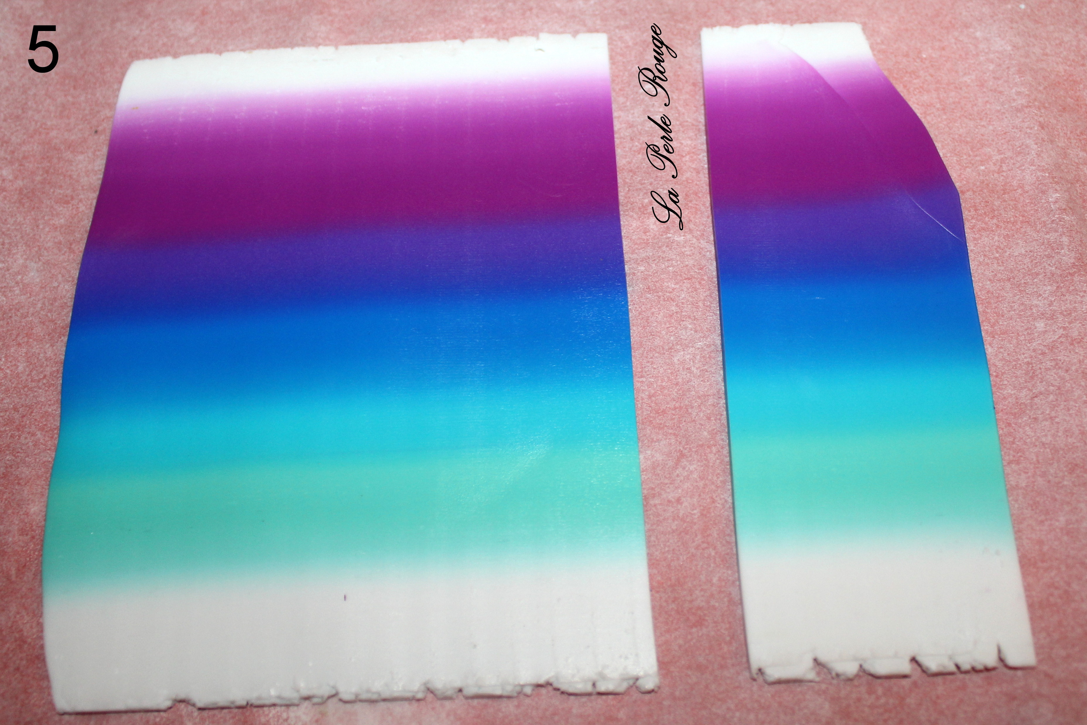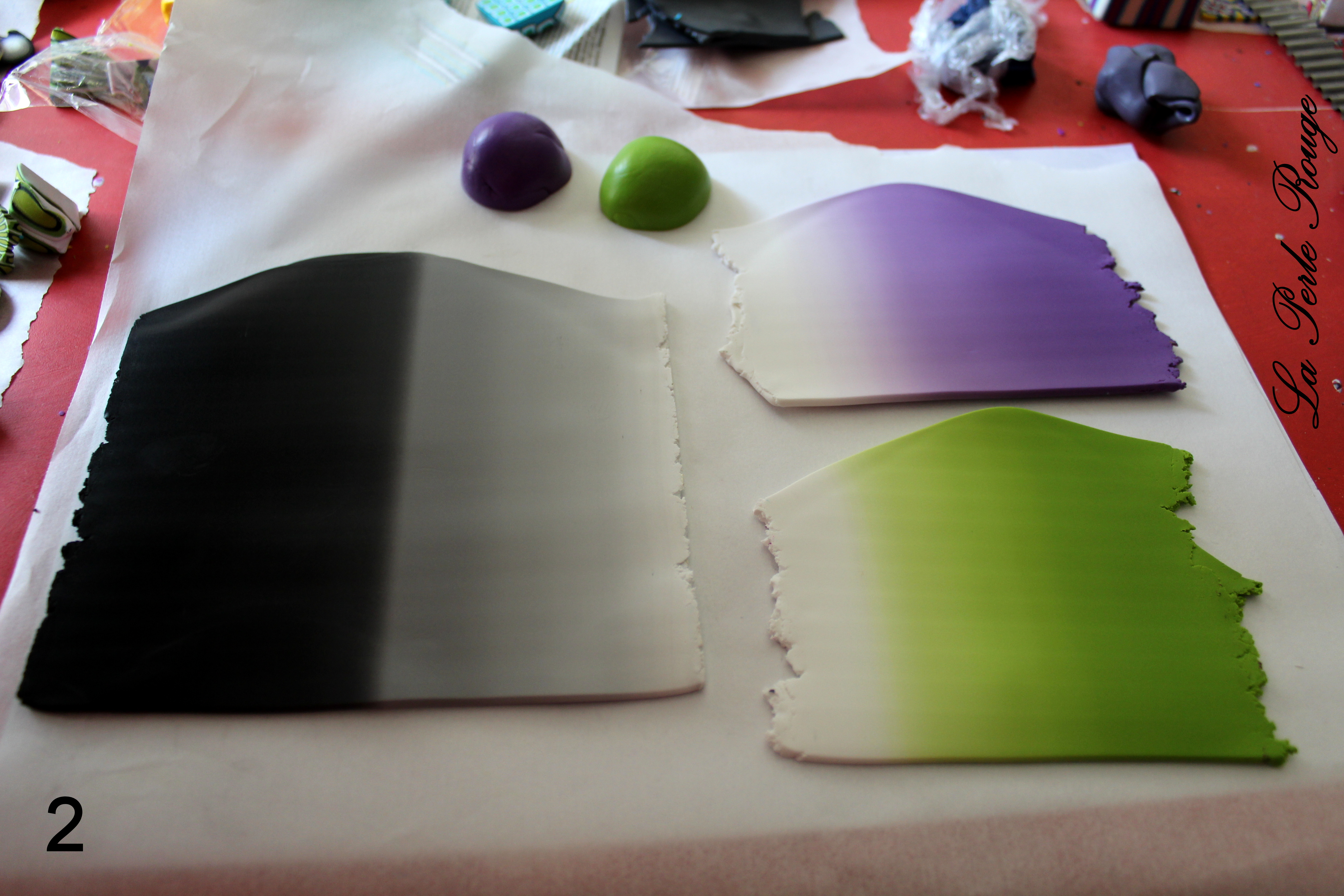 Cette pâte est assez géniale car vraiment transparente après cuisson et très réceptive au ponçage. En revanche, elle est plus capricieuse lors des manipulations crues. Elle n’apprécie pas être malaxée et malmenée. Elle en garde des bulles d’air et des sortes de fissures dont on se passerait bien ici. Soyez donc minutieux lorsque vous vous en servez et évitez les manipulations au maximum. Commencez à aplatir votre pâte au rouleau avant de passer dans la map et de réduire progressivement les cran jusqu’au réglage le plus fin (ici 1 pour mon imperia). Une fois que c’est fait, recouvrez délicatement votre plaque dégradée en essayant de coincer le moins de bulles d’air possible.