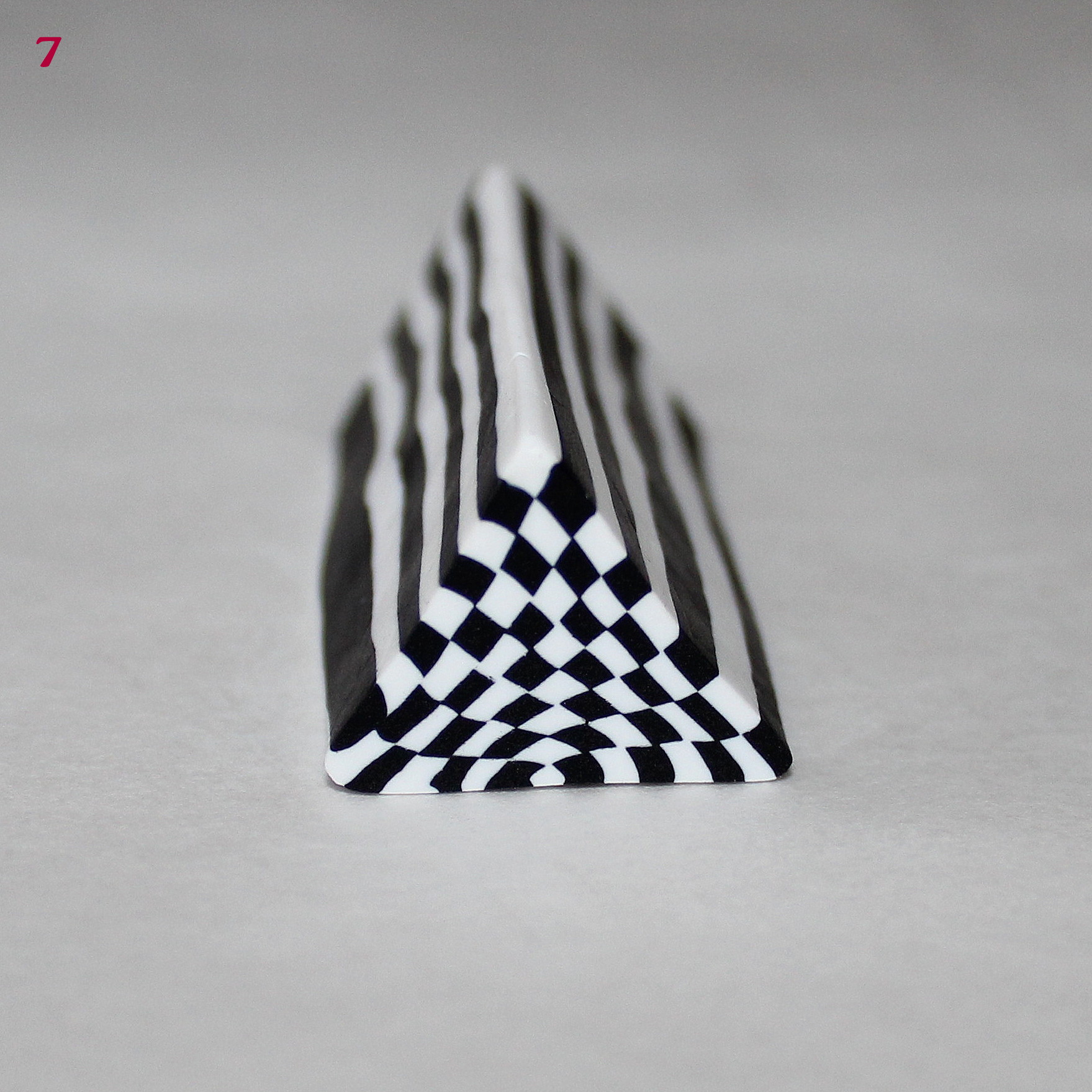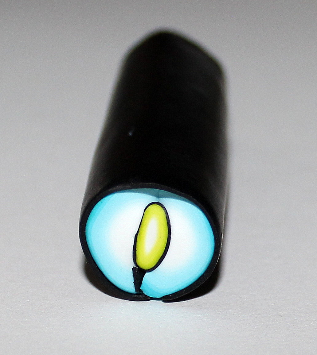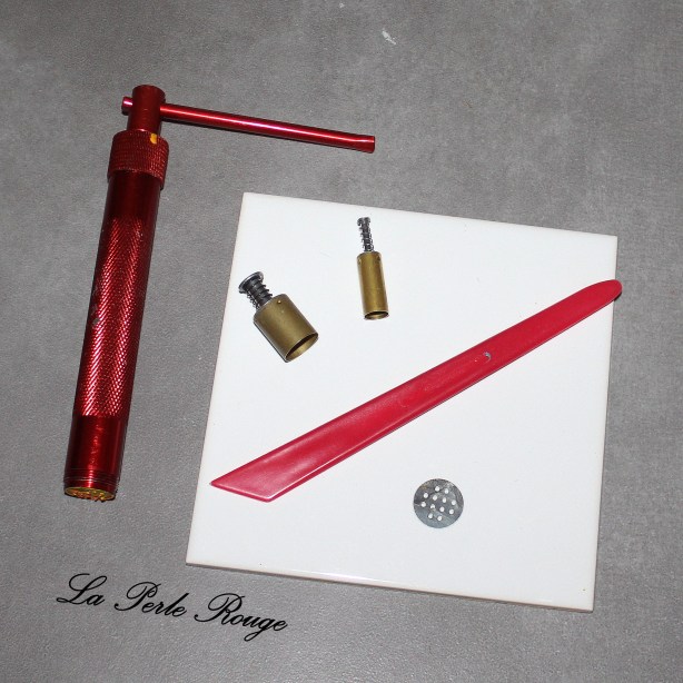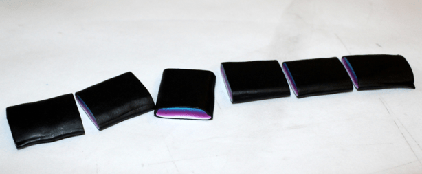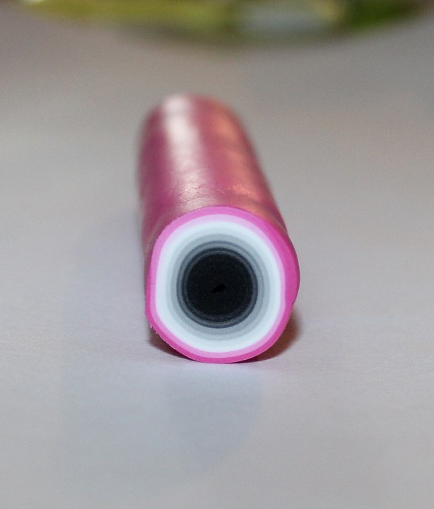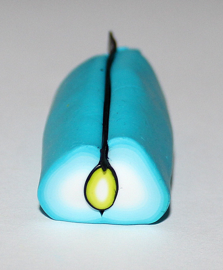 Il nous manque encore deux éléments pour assembler notre cane « fleur ». Tout d’abord, un cœur de fleur qui sera constitué des chutes de pistils et enfin la pâte qui va venir s’intercaler entre les pétales. Préparez un prisme uni et coupez-le en autant de morceaux que de pétales (donc 5, ici). Afin de faciliter le montage de la cane, prenez chaque tronçon du prisme et pincez-le légèrement dans la machine à pâte au cran large :
