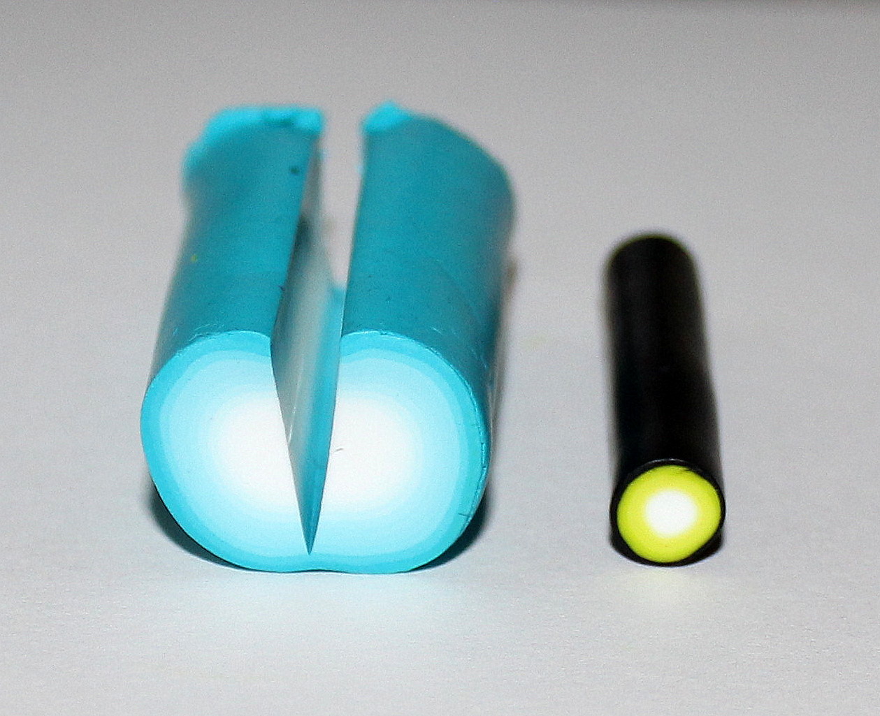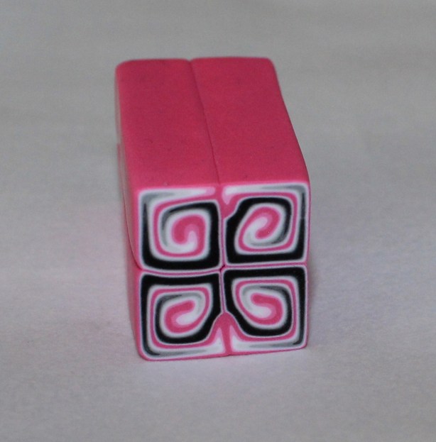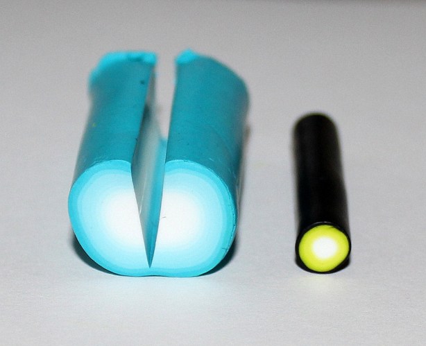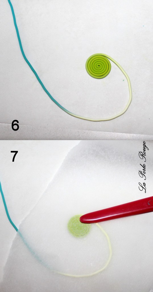 L’opération va consister à fendre la cane dégradée sur tout sa longueur mais pas sur toute son épaisseur à l’aide d’une lame rigide. insérer un premier boudin jaune puis une bande fushia et refermer sans insister sur la pâte.
